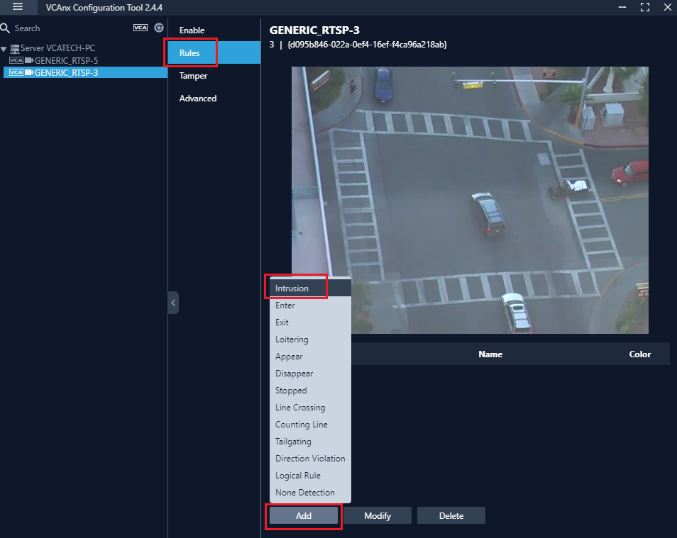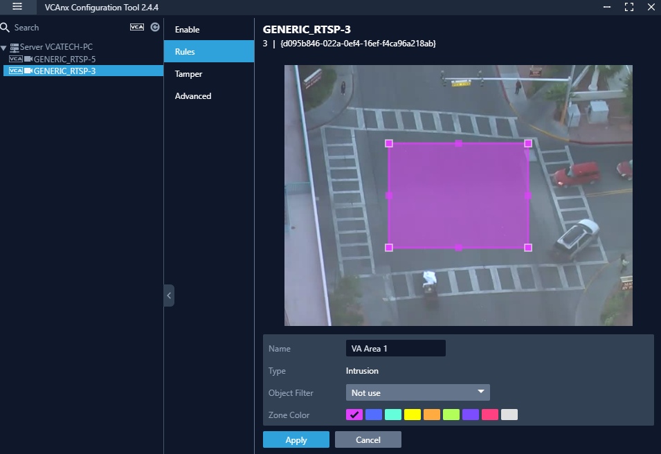 Use the VCAnx configuration tool to configure the analytic rule and produce events.