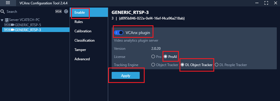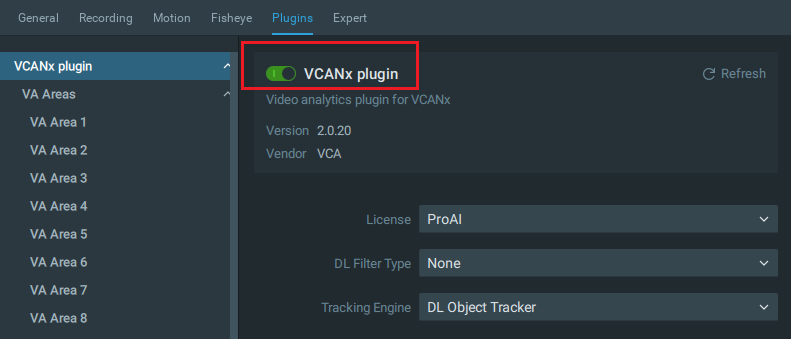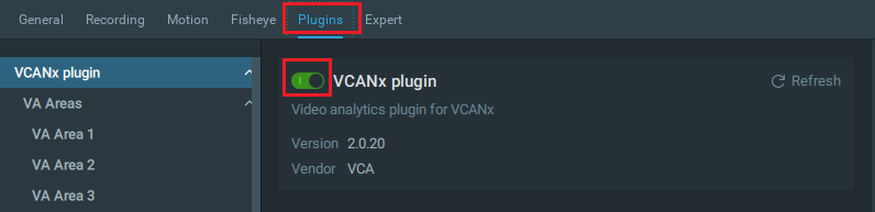 After the Nx Witness server has been configured to use the VCAnx servers, enable the plug-in for each of the cameras where you want to apply video analytics.