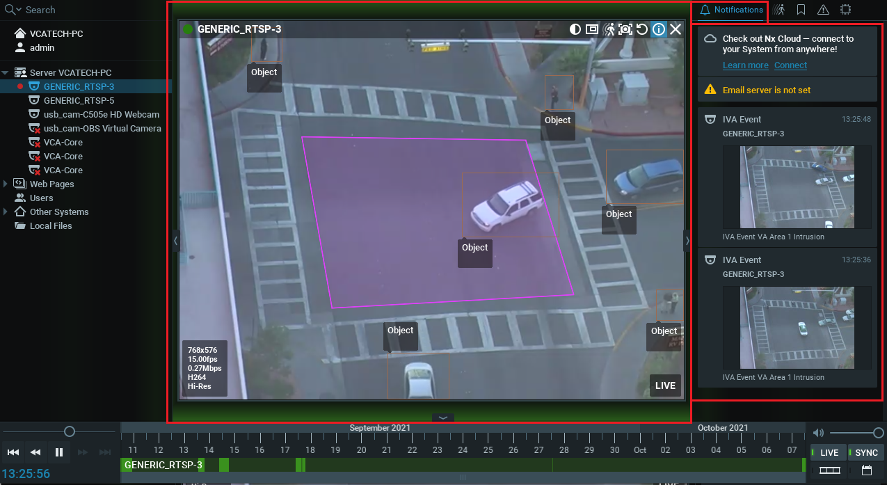 The events generated by VCAedge can be linked to the camera actions feature within Nx Witness and the notifications of the events generated through the plug-in can be displayed in the Notifications tab by clicking on the bell icon at the right top.