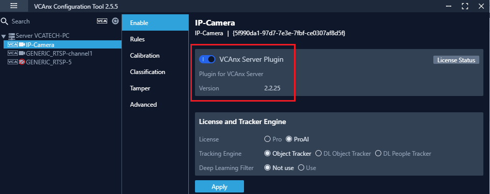 Note: Please make sure that you already have access to the camera and the VCAedge plug-in is installed before applying the analytics license