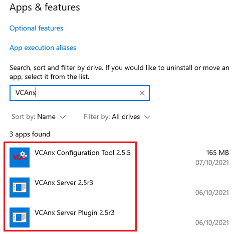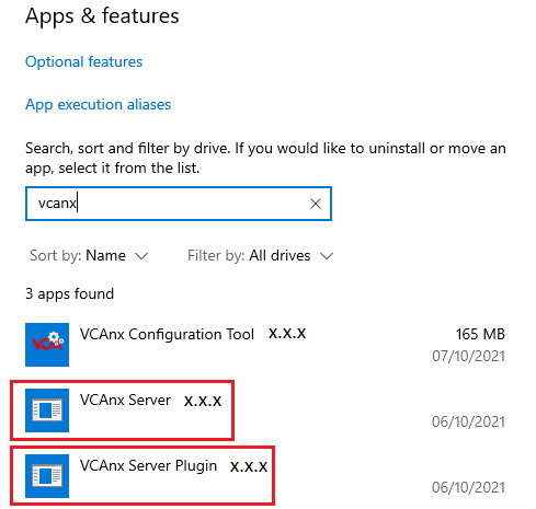 Search for your current installed VCAnx Server and VCAnx Plug-in in Apps & Features