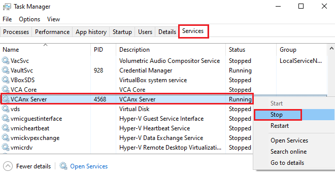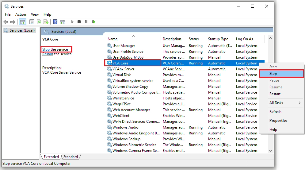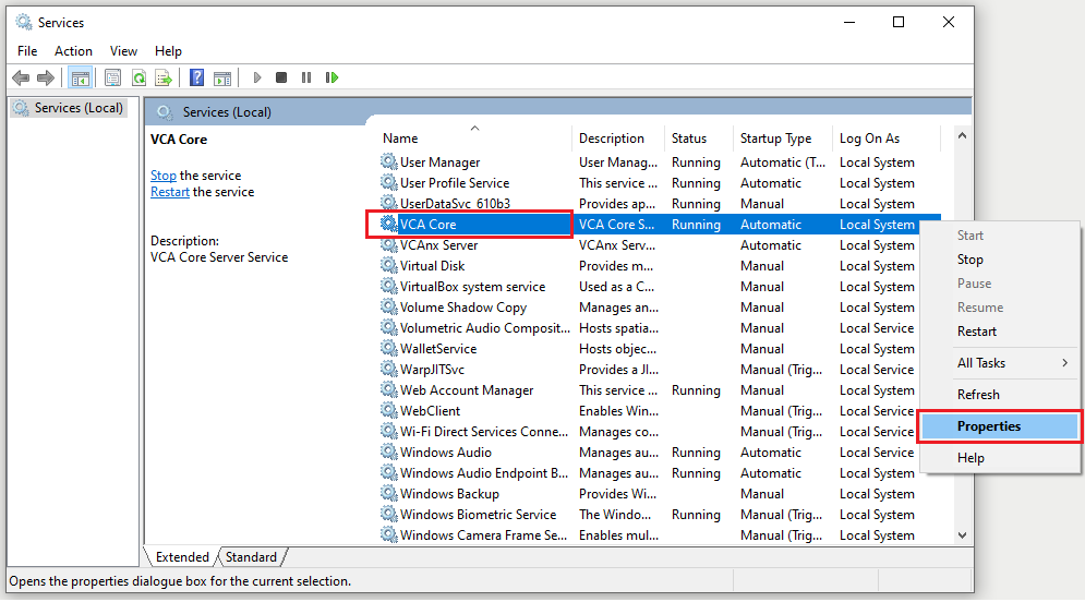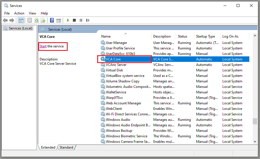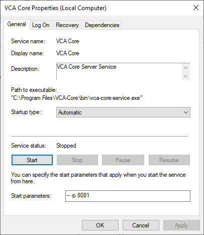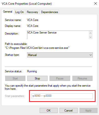 -p 9090 -- -p 8080 where 9090 is the recovery port and 8080 is the web port you want VCAserver to bind to. You can change the last digit on the recovery port, for example -p 9091. Once defined, click the Start button to start the service with these settings.
