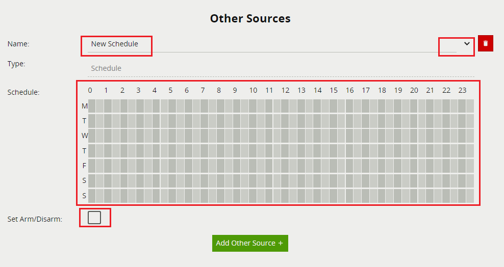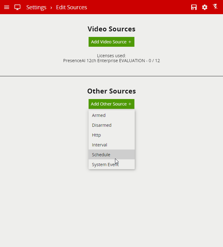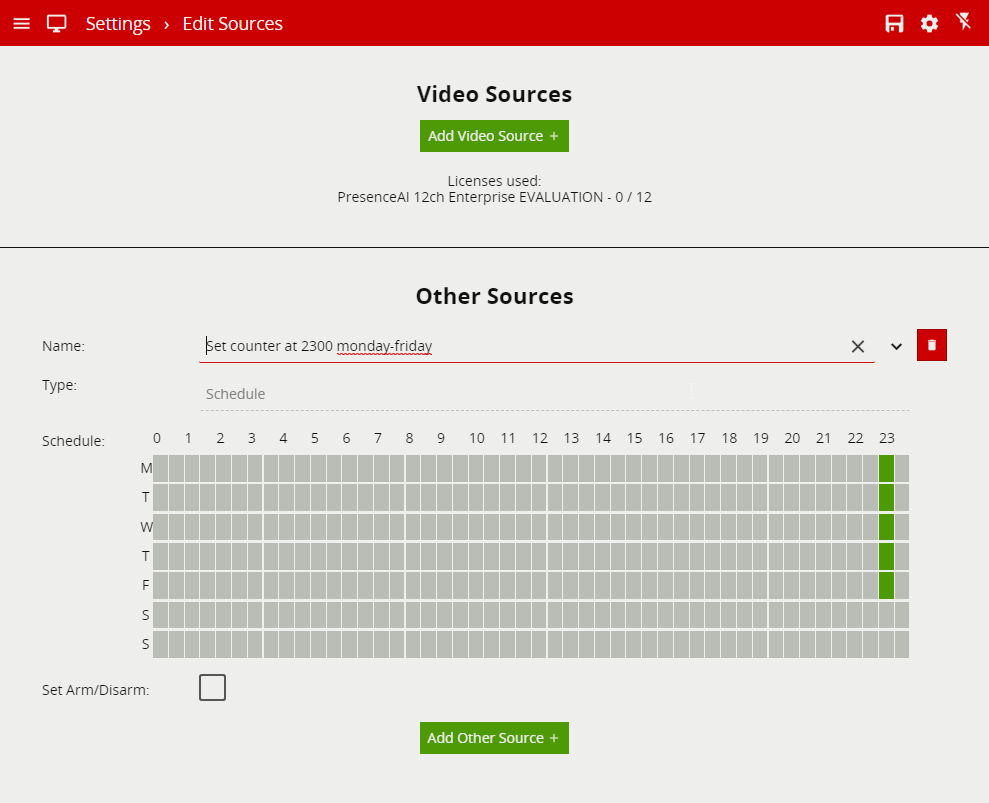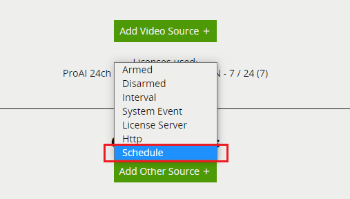 The Schedule option available in the Other Sources feature allows the user to define the period of time events will be created. Alternatively, it can be configured to control the system state of VCAserver.