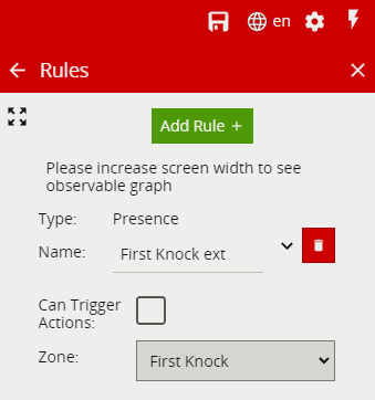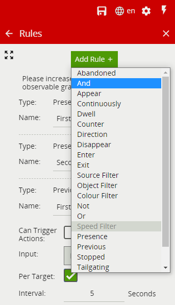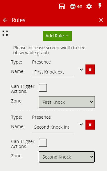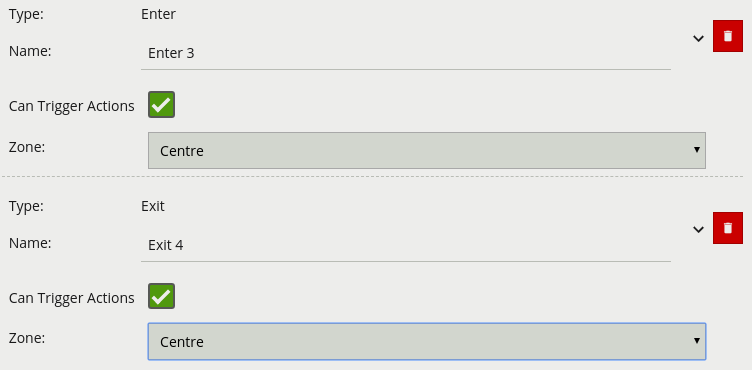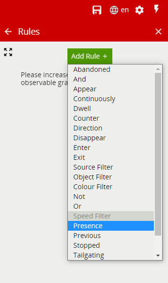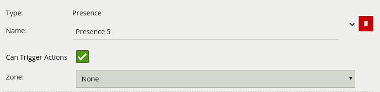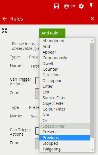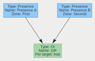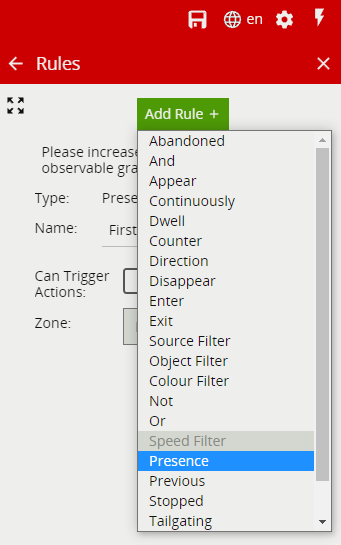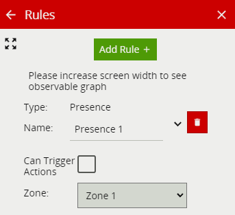 Note: for this example, we have named the zones and rules to allow the feature to be understood. You can use any naming convention for channels, zones and rules. we have used the presence rule to trigger the presence of an object in a zone, you can use any of the available rules.