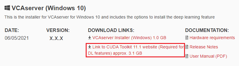 VCAcore supports GPU acceleration for the deep learning features with the following requirements: