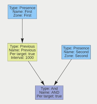 This combination of rules and logical conditions is useful if you want to track objects but only produce alerts when objects pass from one zone to another within a certain period of time.